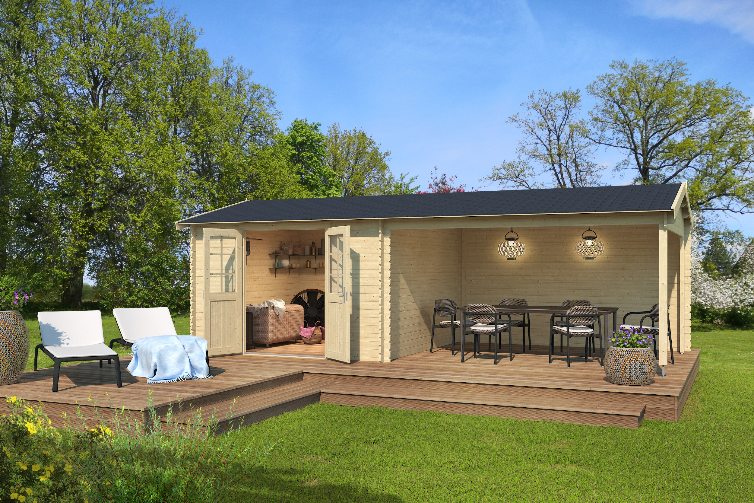 3-seitige Farbbehandlung | Innenseite, Dachpfetten und -bretter naturbelassen; mögliche Farben: schwedenrot, grüngrau, carbongrau und lichtgrau; Türenenen und Fenster in cremeweiß |
