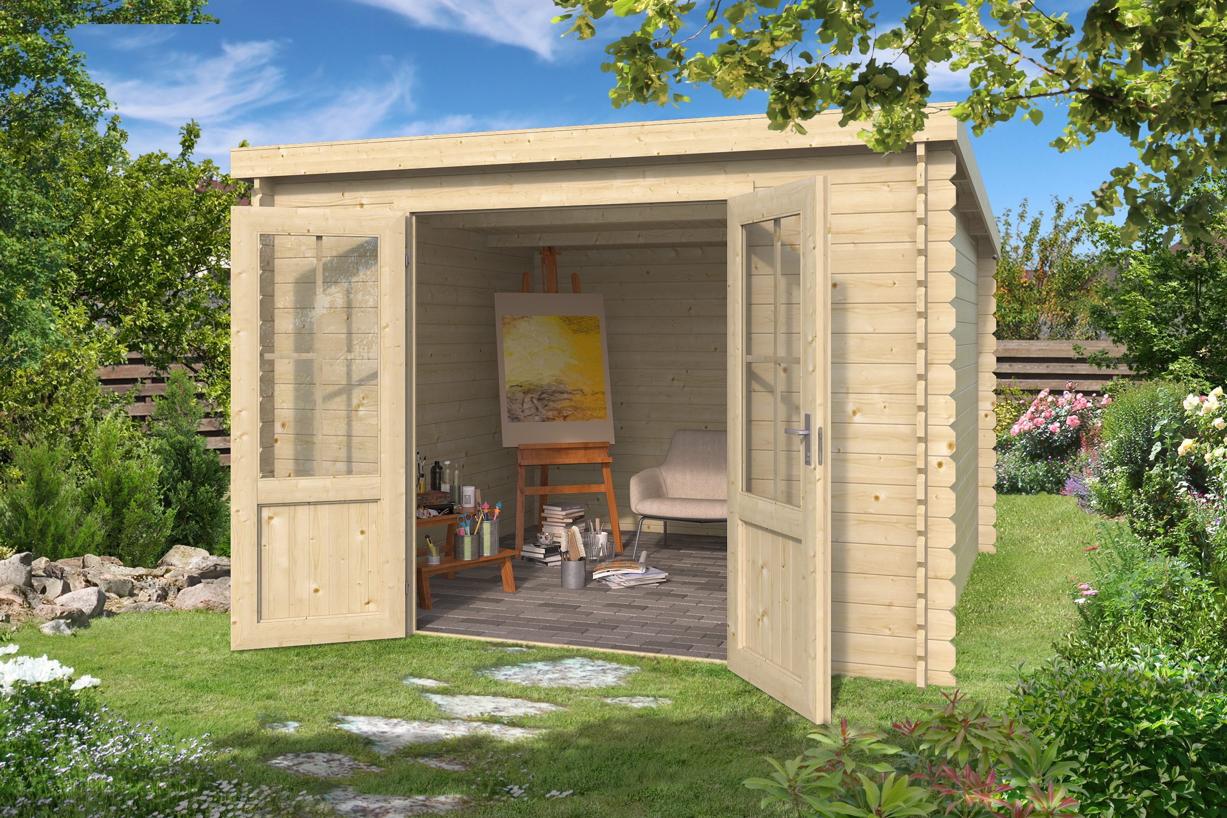 3-seitige Farbbehandlung | Innenseite, Dachpfetten und -bretter naturbelassen; mögliche Farben: schwedenrot, grüngrau, carbongrau und lichtgrau; Türenenenen und Fenster in cremeweiß |