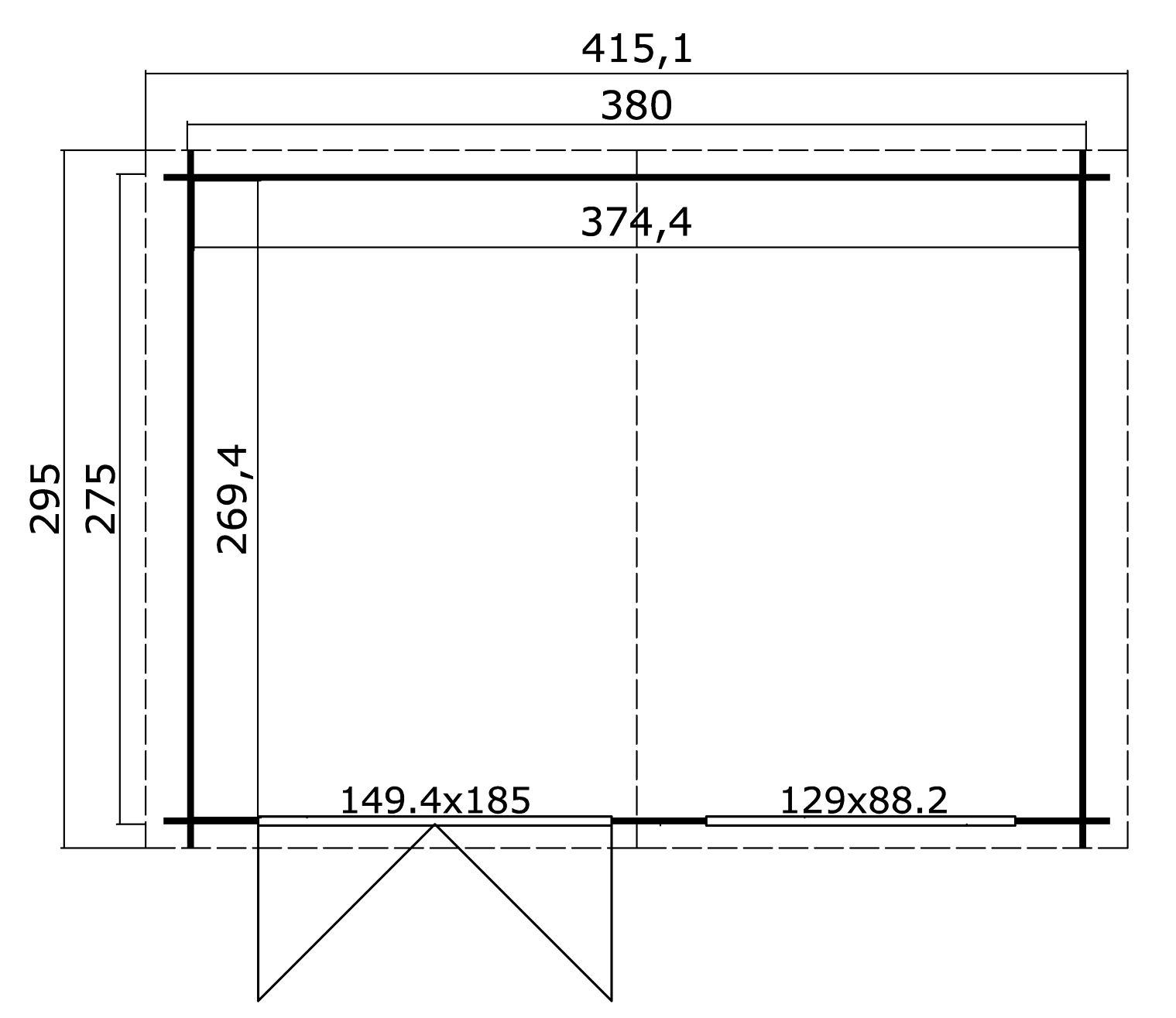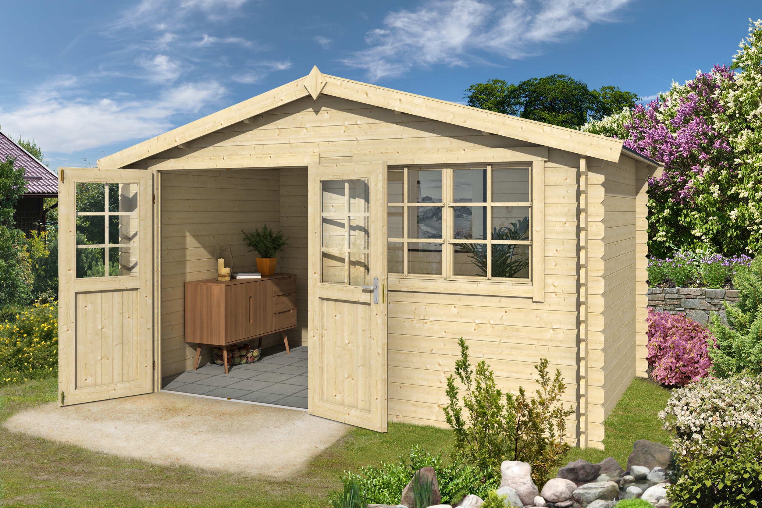 3-seitige Farbbehandlung | Innenseite, Dachpfetten und -bretter naturbelassen; mögliche Farben: schwedenrot, grüngrau, carbongrau und lichtgrau; Türenenen und Fenster in cremeweiß |