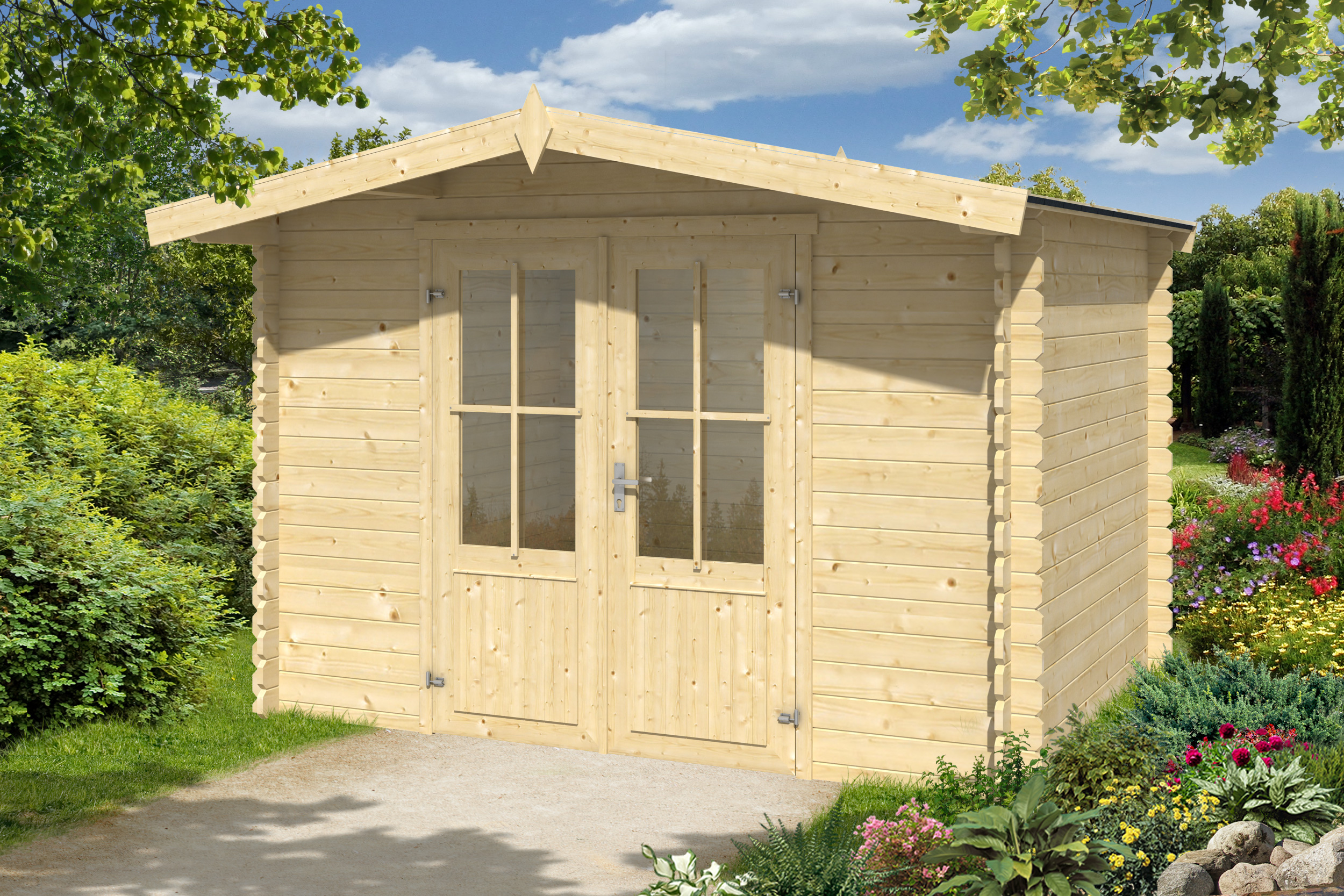 3-seitige Farbbehandlung | Innenseite, Dachpfetten und -bretter naturbelassen; mögliche Farben: schwedenrot, grüngrau, carbongrau und lichtgrau; Türenenen und Fenster in cremeweiß |