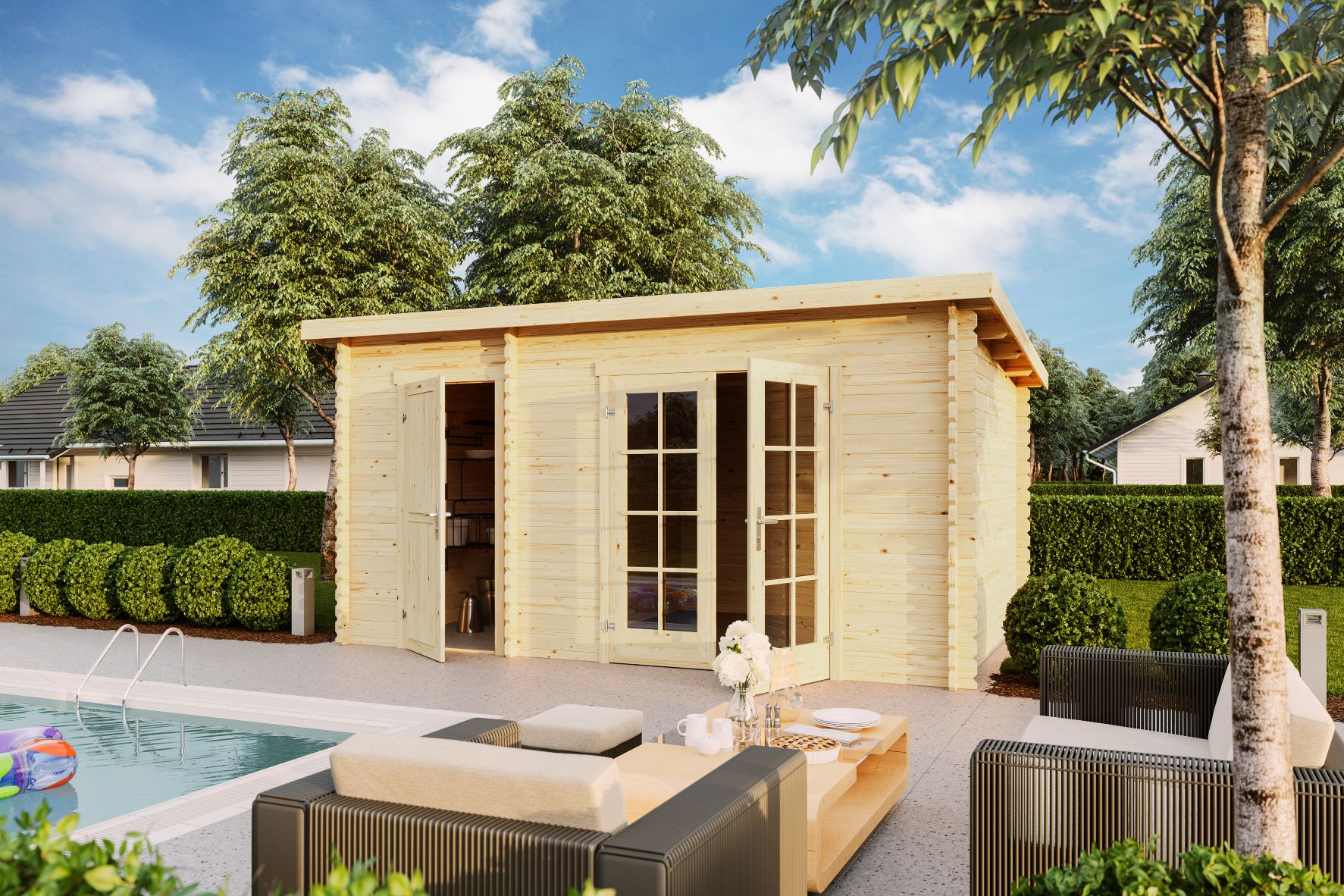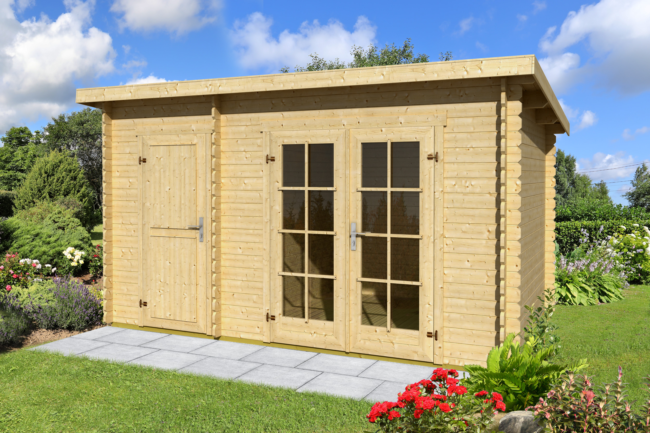 3-seitige Farbbehandlung | Innenseite, Dachpfetten und -bretter naturbelassen; mögliche Farben: schwedenrot, grüngrau, carbongrau und lichtgrau; Türenenenenen und Fenster in cremeweiß |