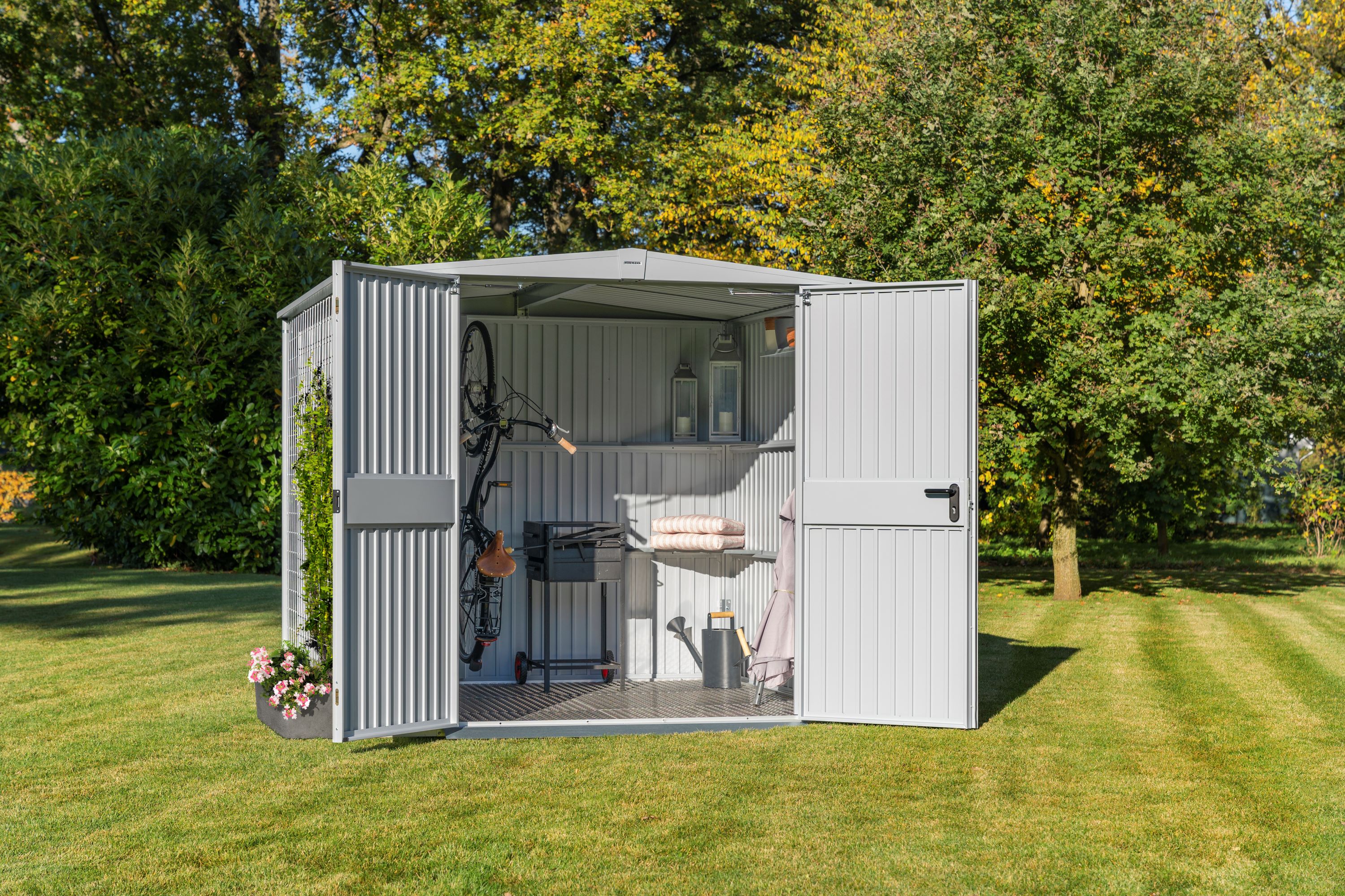 Wetterbeständigkeit | bis zu 150 km/h Wind- und 150 kg Schneelastbeständigkeit (bei geschlossener Türen und korrekter Verankerung im Fundament) |