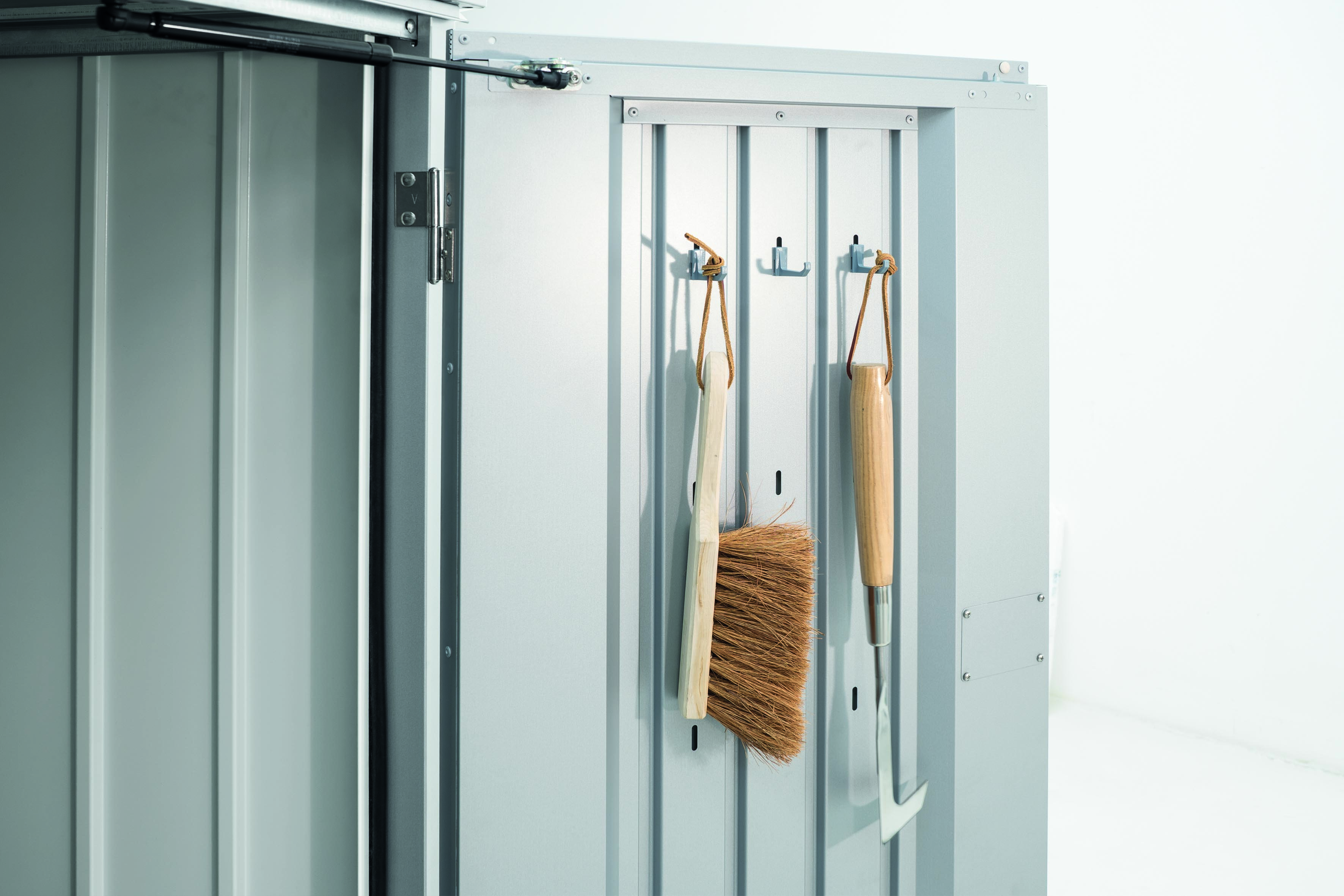 Grundausstattung | komfortable Türenenöffnung mit Gasdruckfeder, 3-fach-Verriegelung mit Drehgriff-Zylinderschloß, Ordnungssystem an der Türeneninnenseite inkl. 6 Aufhängehaken |