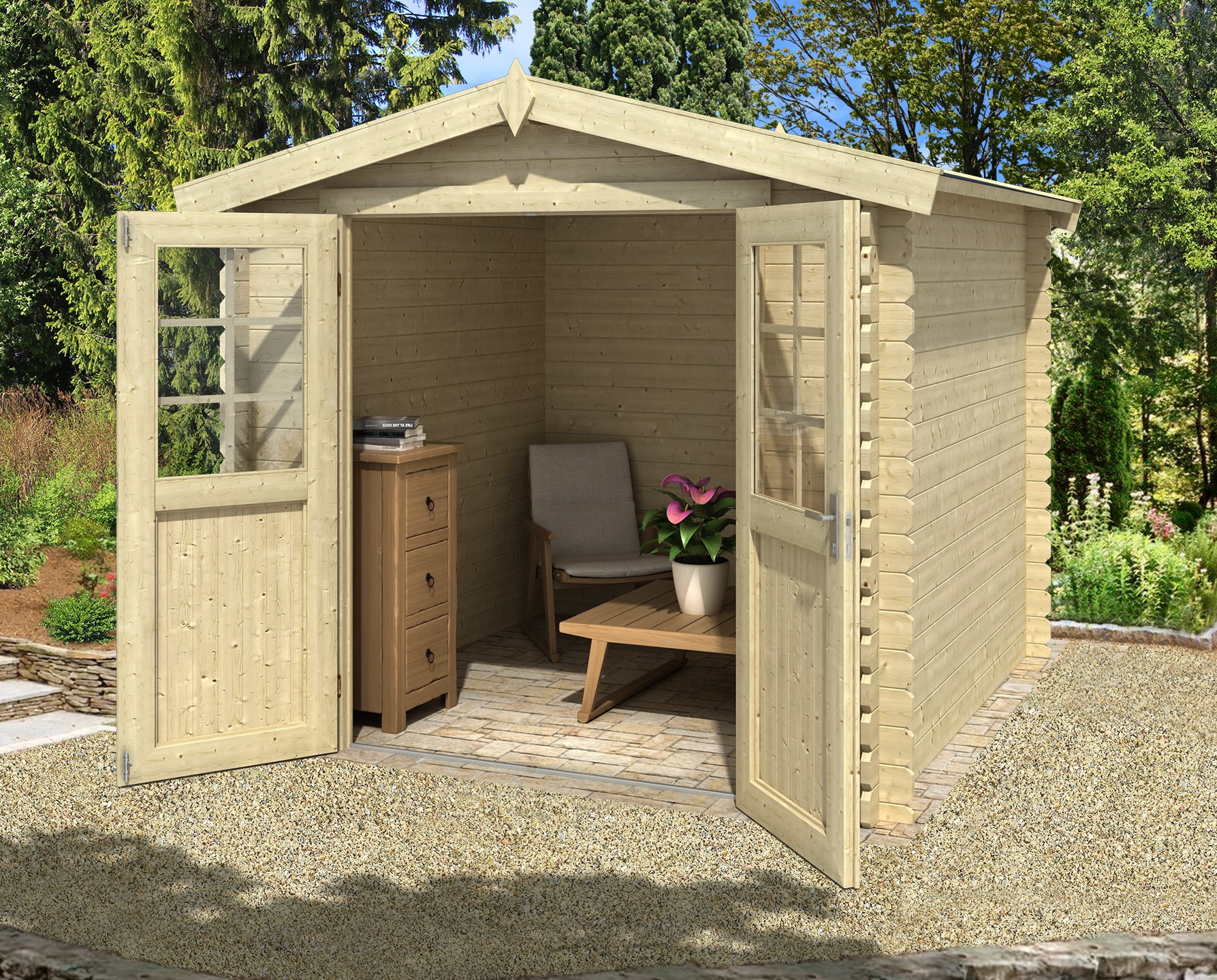 3-seitige Farbbehandlung | Innenseite, Dachpfetten und -bretter naturbelassen; mögliche Farben: schwedenrot, grüngrau, carbongrau und lichtgrau; Türenenen und Fenster in cremeweiß |
