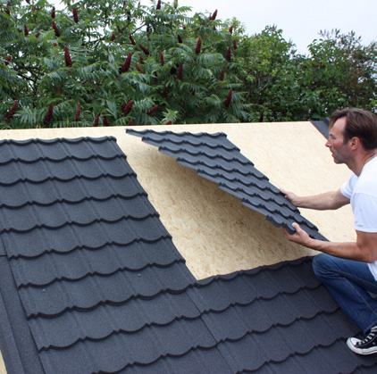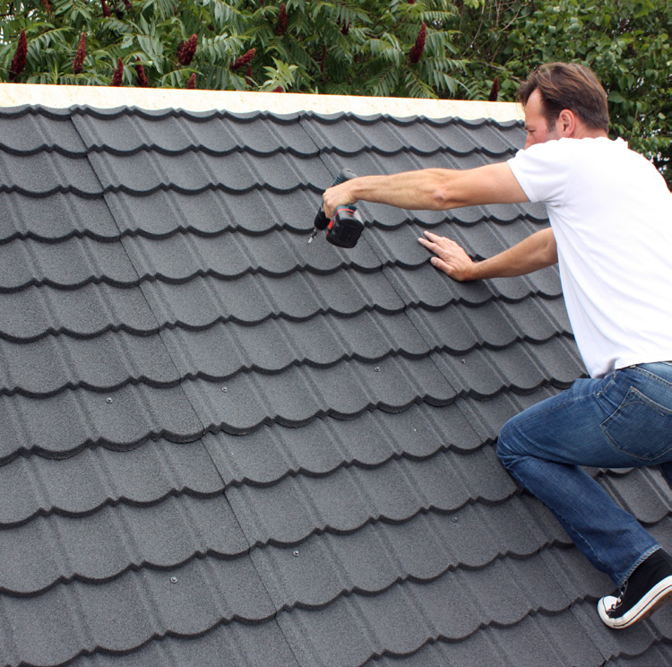 Metallpfannen-Platten aus hochwertigem Stahl mit Aluzink-Beschichtung in den Abmessungen: Nutzhöhe 1090 mm, Nutzbreite 795 mm, kein Zuschneiden nötig: Die Elemente passen auf jedes Dach, die Platten können sowohl in Höhe als auch in der Breite uneingeschränkt überlappt werden. Selbstschneidende Schrauben mit EPDM-Dichtung sorgen für garantierte Dichtigkeit!