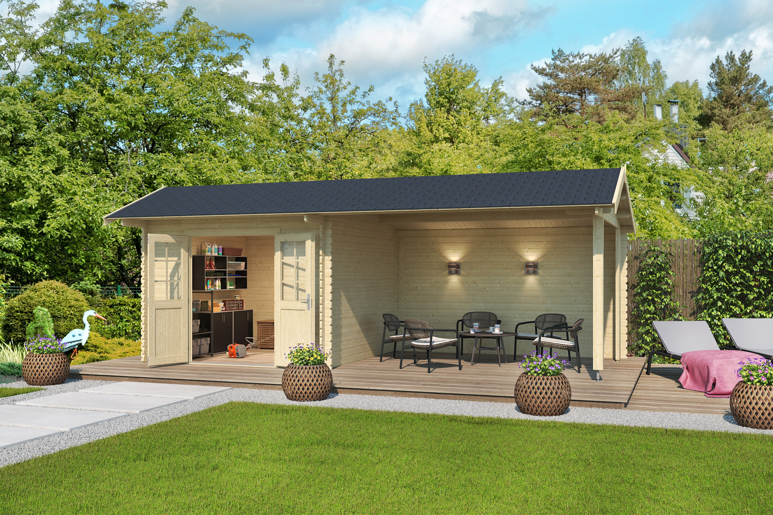 3-seitige Farbbehandlung | Innenseite, Dachpfetten und -bretter naturbelassen; mögliche Farben: schwedenrot, grüngrau, carbongrau und lichtgrau; Türenenen und Fenster in cremeweiß |
