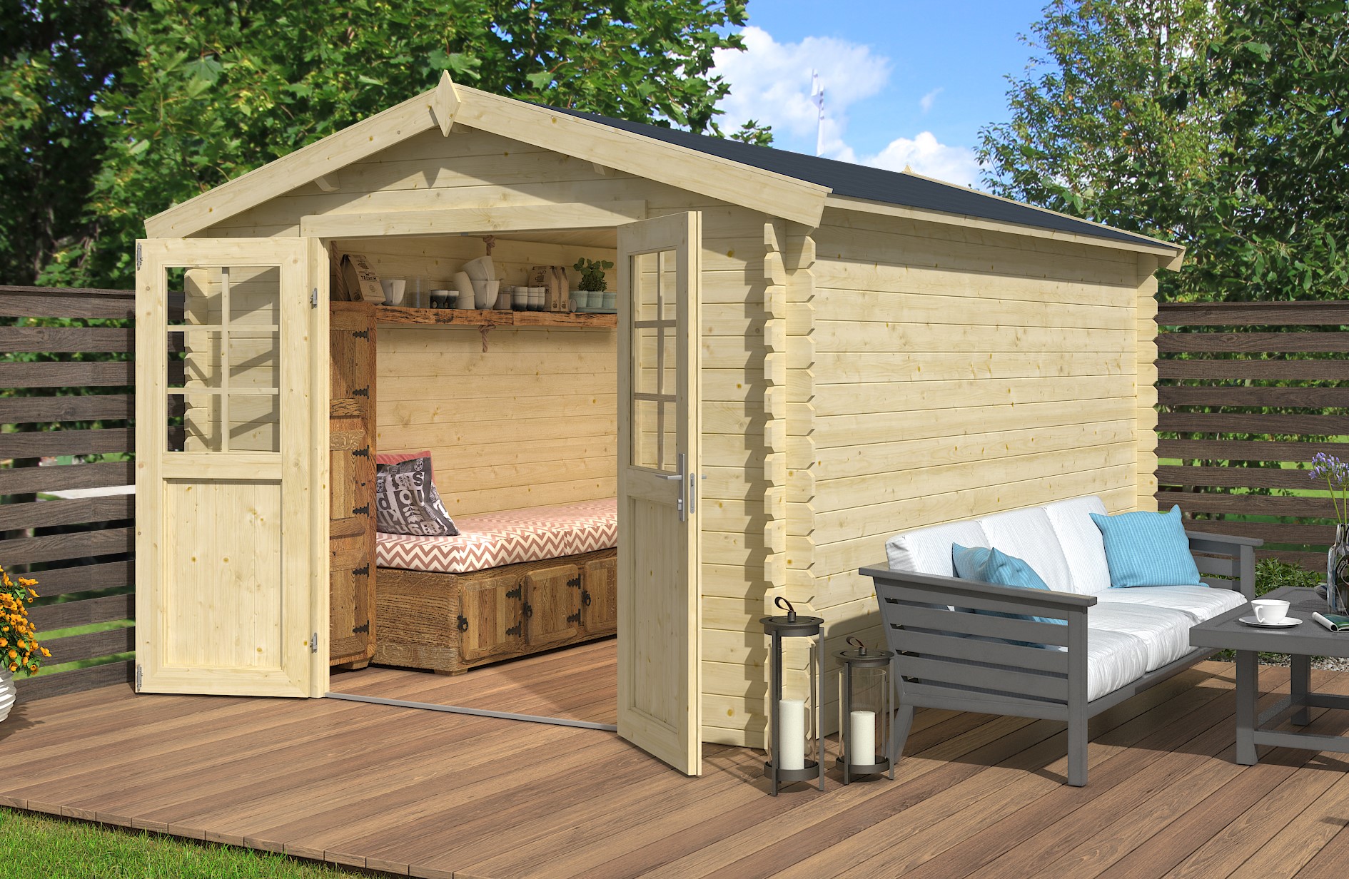 3-seitige Farbbehandlung | Innenseite, Dachpfetten und -bretter naturbelassen; mögliche Farben: schwedenrot, grüngrau, carbongrau und lichtgrau; Türenenen und Fenster in cremeweiß |