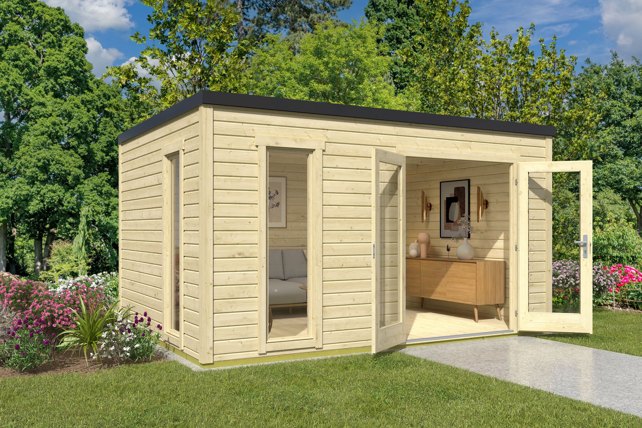 3-seitige Farbbehandlung | Innenseite, Dachpfetten und -bretter naturbelassen; mögliche Farben: schwedenrot, grüngrau, carbongrau und lichtgrau; Türenenen und Fenster in cremeweiß |