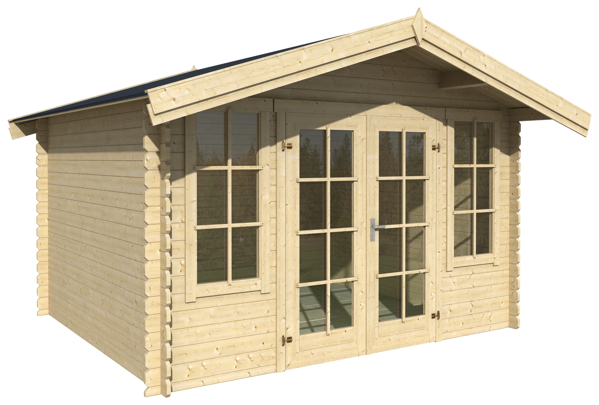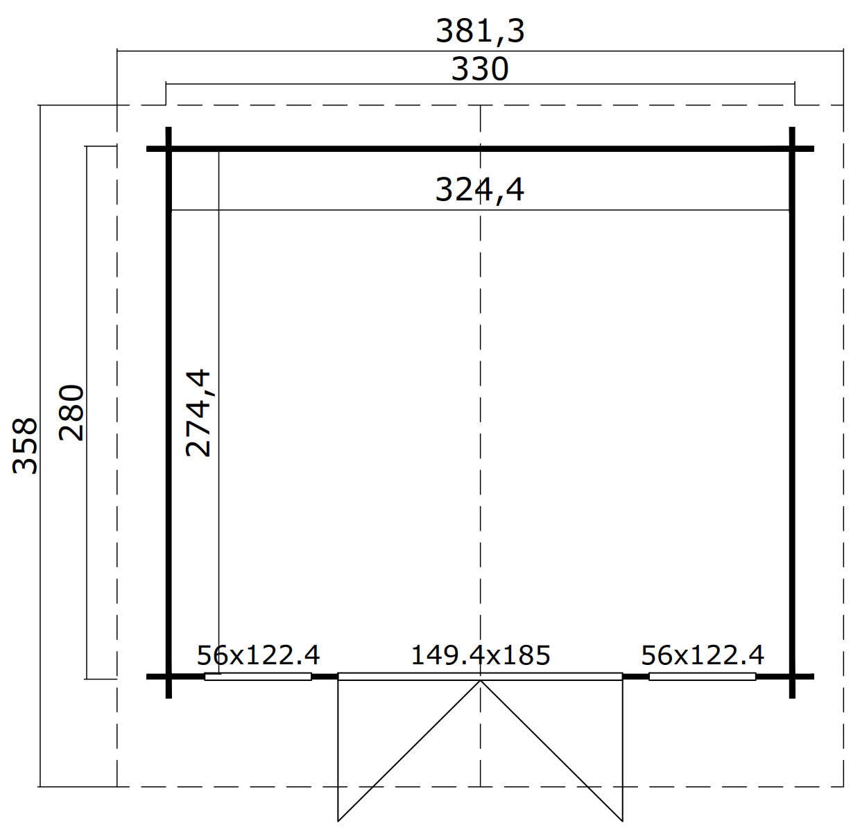 3-seitige Farbbehandlung | Innenseite, Dachpfetten und -bretter naturbelassen; mögliche Farben: schwedenrot, grüngrau, carbongrau und lichtgrau; Türenenen und Fenster in cremeweiß |
